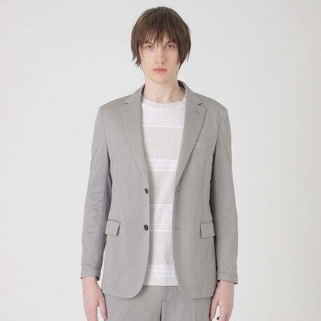 メランジ調のポリエステルジャージー素材を使用したアンコン仕様ジャケット。袖裏や肩パッド等を極力使用しないことで、軽さと快適な着心地を追求しました。
