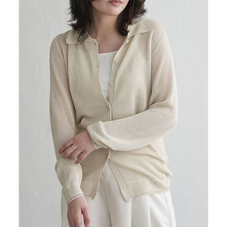 襟付きデザインが上品な印象を与え、カジュアルからキレイめまで幅広いスタイルにマッチします。