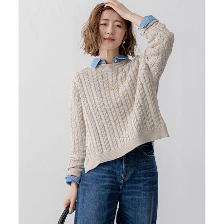 全面にケーブル柄をほどこしたクルーネックのニット。シンプルなコンパクトプルオーバーながら、両脇にグログランテープを付けてアームホールの下まで開く仕様にしています。中にシャツやカットソーを着てレイヤードを楽しむのはもちろん、凹凸感のある編地がコーデのアクセントになり、一枚でも決まりの良いニットです。カラーは、清潔感のあるホワイト(#001)、やわらかな雰囲気のベージュ(#033)、印象引き締まるネイビー(#075)、青みがかった爽やかなライトグリーン(#062)の4色展開です。