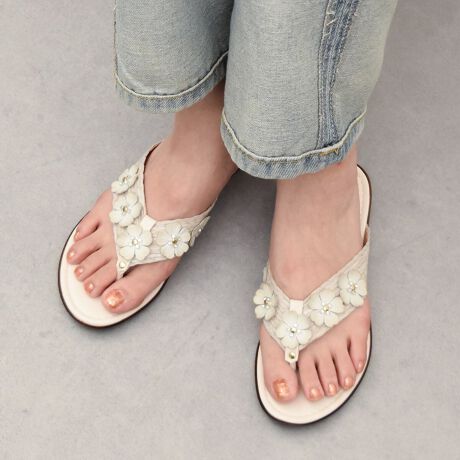 立体感のあるフラワーモチーフに華奢なトングが足をきれいに見せてくれる、大人のリラックススタイルにおすすめのアイテム。