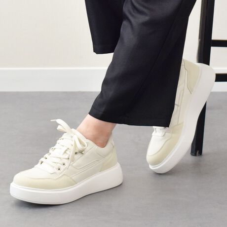 異素材ミックスのワントーン厚底スニーカーは、アッパーに撥水加工を施しているので晴雨問わず履いて頂けます。