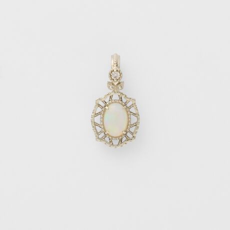 虹のように様々な色が揺らめくカボションカットのオパールを中心に、繊細な透かしとダイヤモンドで装飾を施したチャーム。直線的なディテールのアールデコ調デザインがクラシカルな趣きです。シャンパンホワイトならではの柔らかな色合いは優しく肌に馴染み、イエローゴールドともシルバーとも相性が良いのも魅力の一つです。“幸運”や“希望”など、ポジティブな石言葉を持つオパール。1点でほどよく華がありながらも合わせやすいデザインは、贈り物にもおすすめです。----champagne white----柔らかなシャンパンカラーが特徴的なK10ホワイトゴールドがオリジナル地金として登場。ホワイトの色味を出す為に、プラチナを10%配合したプレミアムな地金です。メッキをかけずそのままのカラーを活かしているのが特徴です。※天然石や天然素材を使用しているものは、サイズ・色味・風合いの違いや、若干の傷、内包物の有無などに個体差があります。予めご了承ください。※オパールは大変柔らかく乾燥に弱い為、取り扱いにはご注意下さい。