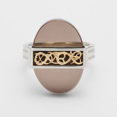 石の上にゴールドの透かし模様を重ね、石に落ちる影や透かしから覗く透明感を堪能する奥行きのあるデザインのrリングです。ゴールドの透かし模様は、北欧の教会の壁面に施された、蔦が絡んだ装飾からインスパイヤされています。オーバル×フラットカットのスモーキークォーツは、落ち着いたトーンながらも力強さのある印象を与えます。※天然石や天然素材を使用しているものは、サイズ・色味・風合いの違いや、若干の傷、内包物の有無などに個体差があります。予めご了承ください。※石は突き刺しですので、水分にご注意下さい。※サイズ直し不可。