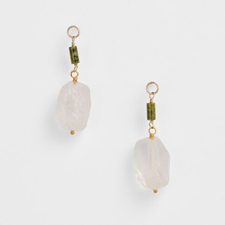 ゴロンとしたボリュームのあるラフなクォーツがメインのピアスチャーム。砂とは、岩石が風化などの自然作用によって粉状になった物を表します。その砂の材料でもある岩石からシーズンテーマの砂を表現。また、パイプ状のジャスパーは、苔むした岩石を表現しています。チャーム自体にボリュームがあるため、スタッズピアスや小さなフープピアスとのコーディネートがおすすめです。※天然石や天然素材を使用しているものは、サイズ・色味・風合いの違いや、若干の傷、内包物の有無などに個体差があります。予めご了承ください。※丸カンはK10、シャンク線はゴールドフィルドを使用しています。
