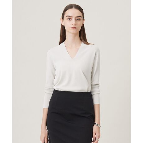 ■デザインネックラインがすっきり上品見えを叶える、シンプルなVネックプルオーバー。ジャケットのインナーに着てもネックラインがすっきりと綺麗に見える衿ラインにこだわりました。シンプルで直線的なVラインが、より女性らしいスタイリッシュな衿元を演出してくれます。トープ(042)とカーキ(054)は衿と袖口にオフホワイトの配色のエッジを効かせ、ポイントにしました。