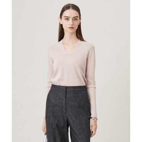 ■デザインネックラインがすっきり上品見えを叶える、シンプルなVネックプルオーバー。ジャケットのインナーに着てもネックラインがすっきりと綺麗に見える衿ラインにこだわりました。シンプルで直線的なVラインが、より女性らしいスタイリッシュな衿元を演出してくれます。トープ(042)とカーキ(054)は衿と袖口にオフホワイトの配色のエッジを効かせ、ポイントにしました。