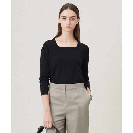 ■デザインデコルテが綺麗に見えるように計算されたネックラインが、上品見えを叶えるニットプルオーバー。キレイ見えしつつも衿元は露出しすぎない安心感のあるサイジングなので、ジャケットインでもスマートにスタイリッシュに着ていただけます。袖口にはさりげなくスリットを入れてポイントに。どんなシーンでも活躍すること間違いなしの万能な一枚です。