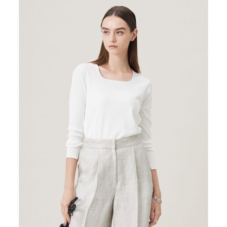 ■デザインデコルテが綺麗に見えるように計算されたネックラインが、上品見えを叶えるニットプルオーバー。キレイ見えしつつも衿元は露出しすぎない安心感のあるサイジングなので、ジャケットインでもスマートにスタイリッシュに着ていただけます。袖口にはさりげなくスリットを入れてポイントに。どんなシーンでも活躍すること間違いなしの万能な一枚です。