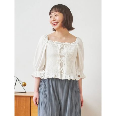 レースアップデザインがフェミニンで甘さをプラスしてくれるトップス