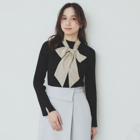 洗練されたスタイルを引き立てる、スカーフ付きリブニット