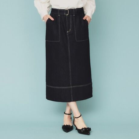 ・シンプルなナローシルエットに、サイドポケットとベルト付きにステッチ使いが特徴的なデニムスカートです。