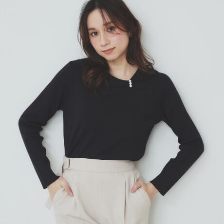 アシメリボンカラーにフェイクパールで魅せるニットトップス