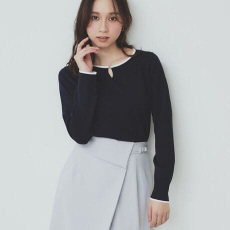 ブライトウールブレンドバイカラーキーネックニット