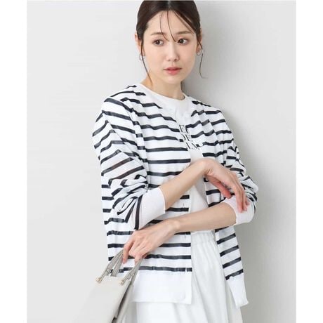 発色のきれいなシアー素材のボーダーカーディガン。少し長めの着丈と適度なゆとりで抜け感のあるサイズ感に仕上げました。きれいめな白の貝釦もさりげないアクセントに。