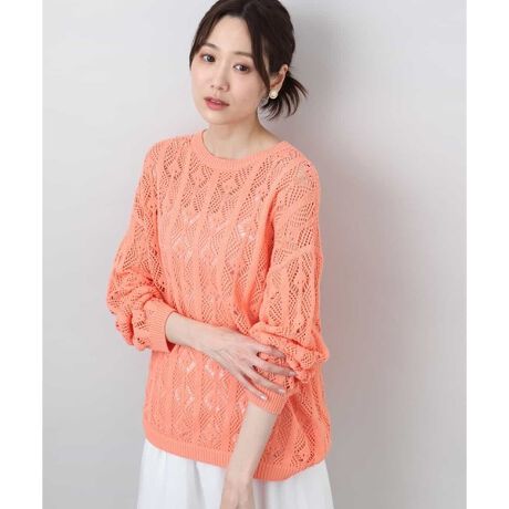 かぎ針風編み地がトレンド感のあるニットプルオーバー。コットン混でゆと