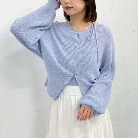 カーディガンは肩を出さずに程よい肌見せで着用することも可能。