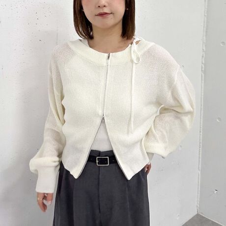 カーディガンは肩を出さずに程よい肌見せで着用することも可能。