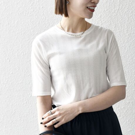 シンプルなクルーネックの、シアー半袖Tシャツ。