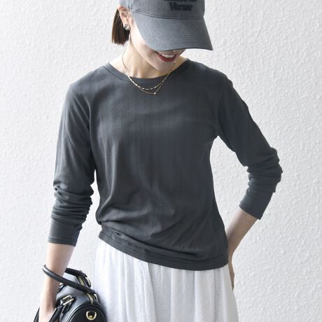 シンプルなクルーネックの、シアー長袖Tシャツ。