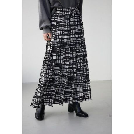 ■グラフィックチェックフレアスカート■ポイントシンプルなシルエットのオリジナルチェックプリントスカート。■ディティールウエストはゴム仕様になっているのでリラックスしてはけるスカートとなっています。程よい広がりのあるシルエットです。■スタイリング手書き風のチェックプリントになっているので、シンプルなニットやスウェットにも合わせやすく、1枚着るだけで着映えのする1枚になっています。オールシーズン着用可能なので、上に合わせるものによってさまざまなスタイリングが楽しめます。■生地ポリエステル素材にオリジナルプリントを施しております。透け感:なし裏 地:あり伸縮性:なし光沢感:ややあり