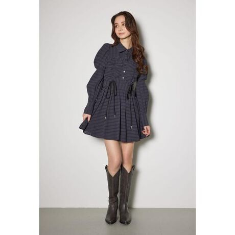 【バストシャーリングがポイントのミニシャツワンピース】■ポイントビスチェディテールでフロントのシャーリングを効かせたデザイン。ビスチェをラウンド型にすることでよりシャーリングが立体的に見え、360度どこから見ても綺麗なシルエットで着用できます。シャーリングは簡単に着脱できるのもポイント。■ディテール誰もが着やすいシャツワンピースのアイテムにバストを活かし、ドロスト風のシャーリング加工が拘りの1着に。色展開によって生地を変えており、WHTとL/BLKは透け感のあるチェック柄を採用し、BLUは張りのあるコットン調の生地で作成しました。■スタイリングミニワンピースなのでロングブーツを合わせたり、ミュールにハイソックスやルーズソックスを合わせてスタイリングを組むのが今季のおすすめ。■生地透け感:WHTとL/BLKのみややあり裏地:ウエスト下からあり伸縮性:なし光沢感:なし厚さ:なし■商品のお気に入り登録お気に入りアイテムの再入荷・在庫1点などの通知を受け取ることができます。[注意事項]※画像の商品はサンプルです。実際の商品と仕様、加工が若干異なる場合があります。※画像の商品は光の照射や角度、お使いのモニター環境により、実物と色味が異なる場合がございます。※着用、お取り扱いの際は、アテンションタグをご確認ください。