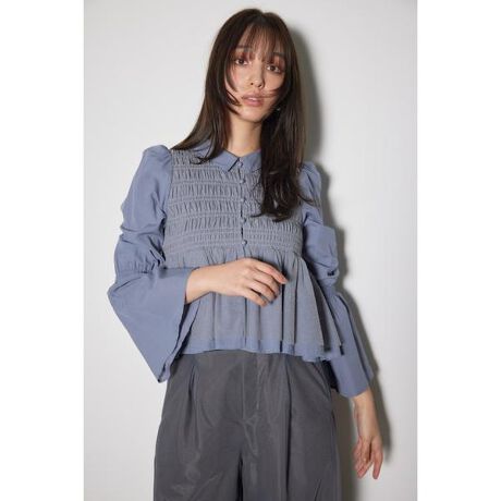 【チュールシャーリングが柔らかな表情をつくるペプラムブラウス】■ポイント女性らしいシルエットが魅力的なチュールシャーリングがポイントのトップスがお目見え。透け感があって柔らかなチュール素材を程よく張りのある生地にドッキングしてシャーリングを施し、ポコポコとした表情が印象的なブラウスに仕立てました。程よく身体にフィットし、軽くて着やすいデザインです。■ディテールシャーリングデザインがポイント。■スタイリングペプラムなので、パンツスタイルでスッキリスタイリングするのがオススメです。■生地透け感:なし裏地:あり伸縮性:あり光沢感:なし厚さ:薄手■商品のお気に入り登録お気に入りアイテムの再入荷・在庫1点などの通知を受け取ることができます。[注意事項]※画像の商品はサンプルです。実際の商品と仕様、加工が若干異なる場合があります。※画像の商品は光の照射や角度、お使いのモニター環境により、実物と色味が異なる場合がございます。※着用、お取り扱いの際は、アテンションタグをご確認ください。