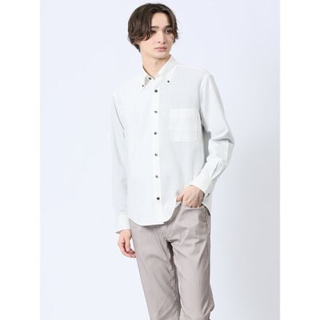 清潔感のあるボタンダウンの長袖シャツです。同色系の異素材で、フロントを縦に切り替えたデザインがポイント。裾部分はラウンドテールになっており、タックインとタックアウト、双方の着こなしを楽しめます。左胸ポケット付きで利便性にも優れています。キチンと感があるので、プライベートやオフィスカジュアルにオンオフ兼用で大活躍してくれます。