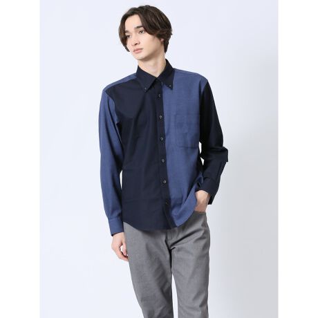 清潔感のあるボタンダウンの長袖シャツです。同色系の異素材で、フロントを縦に切り替えたデザインがポイント。裾部分はラウンドテールになっており、タックインとタックアウト、双方の着こなしを楽しめます。左胸ポケット付きで利便性にも優れています。キチンと感があるので、プライベートやオフィスカジュアルにオンオフ兼用で大活躍してくれます。