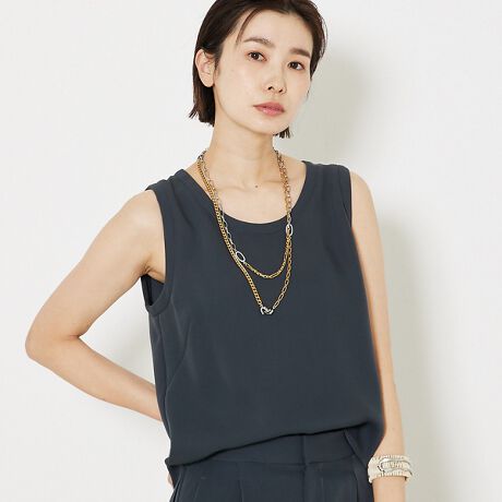 ジャケット・パンツと同素材の、上品な光沢と落ち感が魅力のトルコサテンノースリーブ。