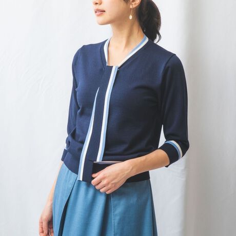 首元のボウタイがエレガントな風合いを演出するニットプルオーバー。生地端に配色ラインを施すことでスタイリングに表情が生まれ、上品な印象を与えます。生地端のリブ切り替えが程よいフィット感をプラス。ボリュームのあるAラインのスカートやバギーパンツと合わせると、さらにクラシカルな装いを楽しむことができます。
