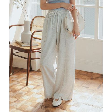 オールシーズン使える裏毛スウェット素材。脚のラインが出ないリラックスサイジングながらセンターシームが縦ラインを表現。コード紐でサイズ調整も可能なウエストはゴム仕様で穿き心地も快適です◎低身長さんにもうれしいプチサイズとの2丈展開です。