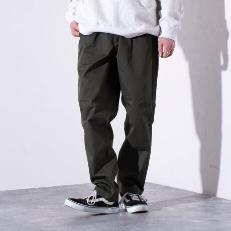 深めの股上でリラックス感があり、ワンタックで腰周りはゆとりを持たせつつ、裾にかけてやや細くなるテーパードシルエットに仕上がっています。