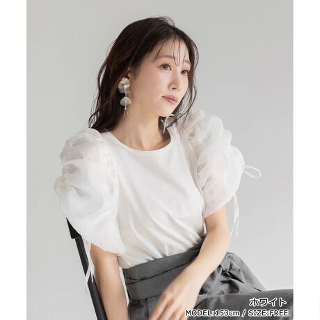すっきりとした身頃と立体感あるボリュームスリーブのコントラストが華やかなトップス。