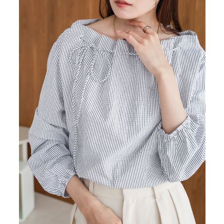 ネックにたっぷりと施されたギャザーが顔周りを華やかにしてくれる、大人フェミニンな印象のブラウス。袖ぐりにはゴムを入れてギャザーをよせており、程よくゆったりしたふんわりシルエット。目を惹くストライプ柄で1枚着としても映えるデザインながら、ジャケットや羽織りのインナーとしても使いやすい着回しアイテム。デイリー・お仕事両シーンで活躍する1着です。