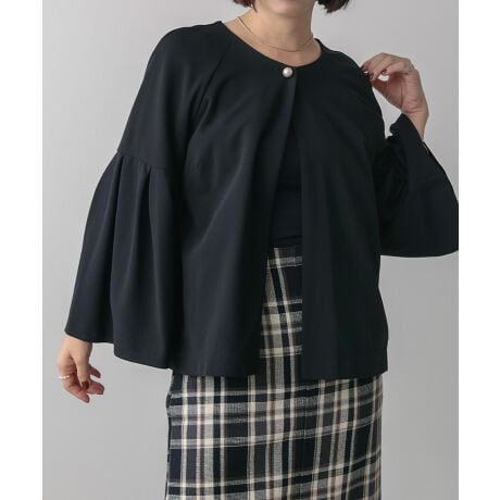 ノーカラーデザインと優雅なパフスリーブが印象的なジャケット。シンプルながらも、前面のパールボタンが上品なアクセントとなり、特別な日の装いにもぴったりです。全面に施されたタックが、女性らしいシルエットを引き立てます。また、バックデザインはティアードになっており、後ろ姿も抜かりなし!