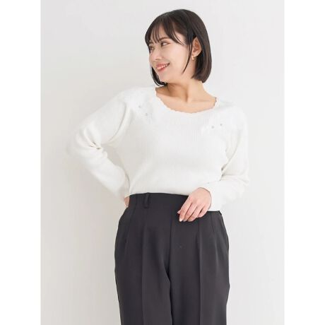 ・スカラップ仕上げのラウンドネックも大人可愛いポイントに。