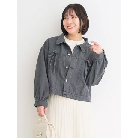 胸元のリボンがガーリーな印象をプラスする甘めデニムジャケット