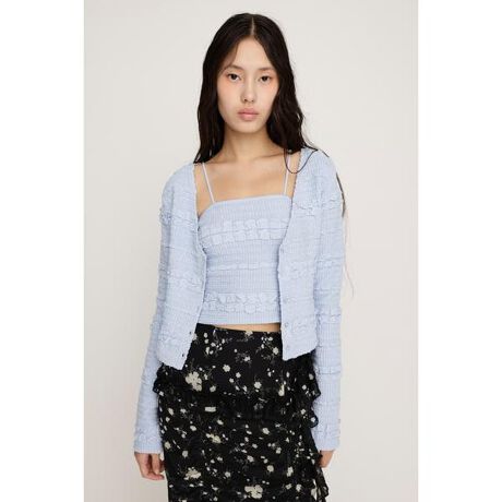 【FRONT BUTTON CAMI 2P】■POINT:キャミソールとカーディガンの嬉しい2ピースセットのアイテム。カットソー素材なので、春夏秋と長い期間で着用できます。■DETAIL:Vネックのカーディガンなので、デコルテ周りはすっきりとした印象に。インナーのキャミソールは肩紐を細くしているので、一枚で着用しても華奢で女性らしい雰囲気を演出してくれます。■STYLING:単体でも着回しでき、定番のデニムと合わせるのがおすすめです。バランスの取りやすいジャスト丈なので、ボトムスを選ばず着用できます。■FABRIC/MATERIAL:ポコポコとした表面感のあるカットソー素材のふくれジャガードを使用しています。■透け感:なし■光沢感:なし■伸縮性:あり■裏地:なし※本品は素材の特性上色落ちします。洗濯、クリーニング、着用(使用)時に他の衣類や雑貨、家具類に色移りする事があります。特に汗や雨等で湿った状態では、色落ちが顕著になります。白、淡色との組み合わせは避け、お取り扱いには十分ご注意下さい。本品は過度な力の加わりで縫い目が開いたり、織り糸が滑り織目が開く性質があります。また、引っ掛けにより糸の飛び出しや引きつれが生じやすいのでご注意下さい。※商品画像はサンプルのため、色味やサイズ、素材の混率等の仕様に変更がある場合がございますので、予めご了承ください。※一部予約商品につきましては生産上の都合によりお届け予定日や店頭発売と前後する場合もございます。※追加生産商品は、一部の店舗、通販で販売中の場合がございます。予めご了承下さい。