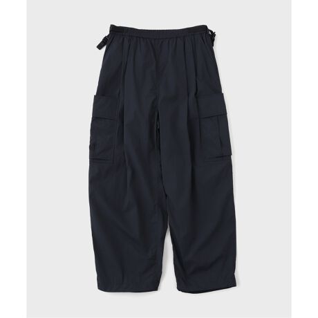 ポケットにものをたくさん入れた際にもずり落ちないよう、ワンモーションでウエスト周りを固定できるアジャスター仕様を開発。膝から裾にかけて若干テーパードしたワイドシルエット。前身に深めの2タックを配置。