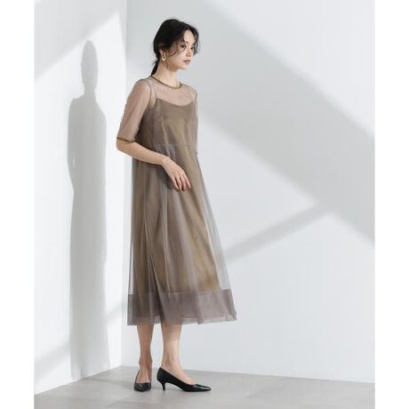 チュールとシャンブレー素地を組み合わせたドレス。デザインはシンプルながら、素材の組み合わせやうしろのリボンでkaeneらしさを演出。落ち着いたカラー展開で結婚式やパーティーはもちろん、お出掛け着としても着回しやすいアイテムです。