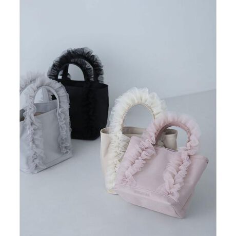チュールのフリルハンドルがトレンドの、バレエコアな雰囲気漂うポリキャンバストートバッグです。ポリエステルを使用しているので汚れが付きづらく、色落ちの心配もありません。中央のポーチはホックで取り外しが可能。マチはしっかりと取っているので、お弁当箱や500mlペットボトルは立てた状態で収納が可能な容量です。※モデルの着用画像の場合、光の当たり具合により、実際の色味と異なって見えることがございます。色味は、商品単体の画像をご参照ください。