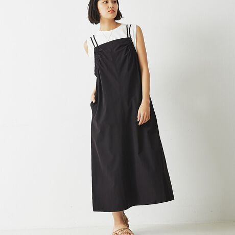 袖ぐりのギャザーディテールがポイントのキャミソールワンピース。肩ひもの長さは後ろのアジャスターで調節可能です。インナー次第で春から秋まで長く着れるアイテムです。
