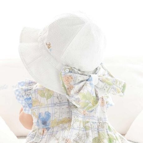 つば裏と後ろのリボン部分にリバティプリントを使用し、お色は落ち着いたホワイトと女の子らしいピンクの2色展開です。