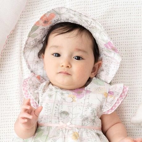 つば裏と後ろのリボン部分にリバティプリントを使用し、お色は落ち着いたホワイトと女の子らしいピンクの2色展開です。