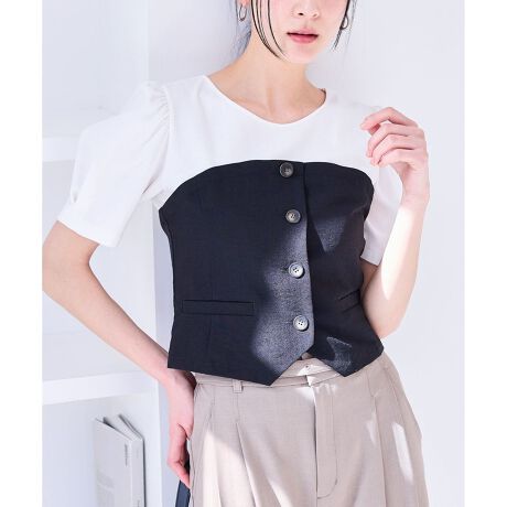 袖のパフスリーブが女らしいビスチェドッキングのプルオーバー。