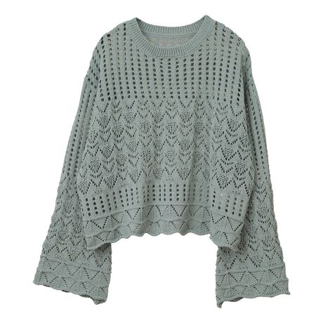透かし編みで抜け感を演出したニットプルオーバー。様々な柄を組み合わせた遊び心あるデザインに仕上げた1着です。裾に向かって広がるボリュームスリーブも女性らしいアクセント。1枚合わせるだけでグッとお洒落度がUPするおすすめのアイテムです。