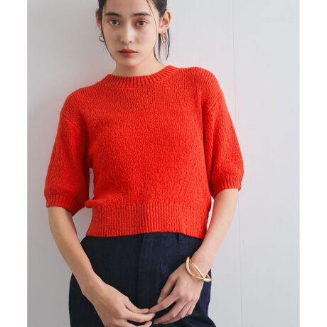 カジュアルなブークレ糸を使用。ルーズでナチュラルな糸で、春から初秋にかけて使いやすいニット。