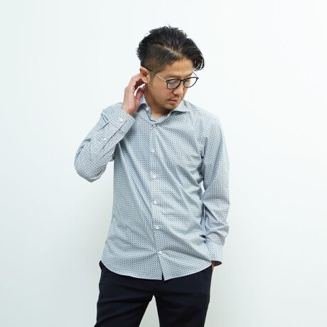 HITOYOSHIとのWネームのドレス仕様定番ワイドカラー、淡水貝のシロ釦など、こだわりが詰まったシャツになります。