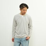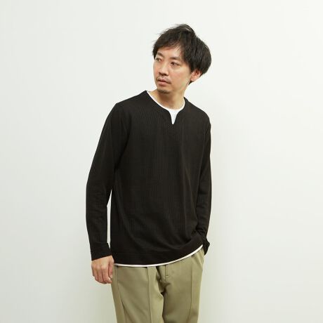 フェイクレイヤー仕様のキーネックTシャツ。