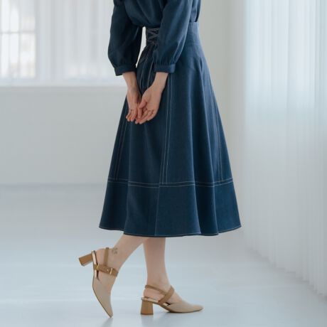 バックのレースアップがアクセントになったポリデニムスカート。裾切り替えを加えたフレア感のある愛らしいシルエットがポイント。カジュアルさもありつつ、女性らしい着こなしを楽しむことができる嬉しいアイテムです。■fabric透け感[無し]裏地[すべて有り]伸縮性[無し]生地の厚さ[やや薄手]ウエストゴム[有り]ファスナー[有り]ポケット[無し]